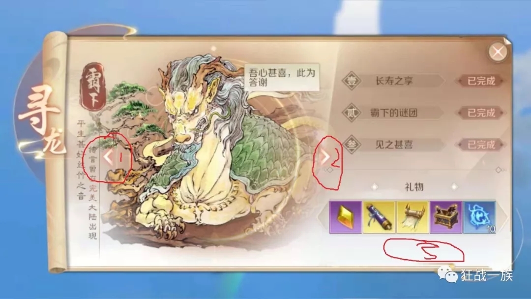 我们每次做完寻龙后,会自动跳转到下一轮寻龙,如果没有领取奖励请用图片标注位置1和2进行选择,