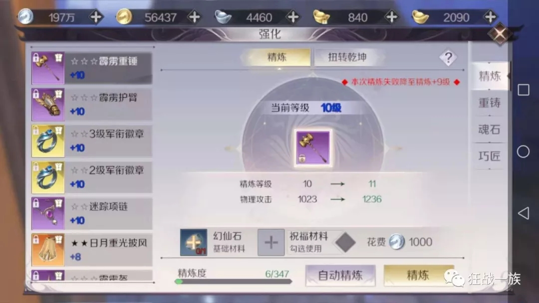 精炼系统是游戏里面最让人头痛的系统了,各位看官如果不是氪金大佬,还是慢慢积攒材料慢慢练吧~