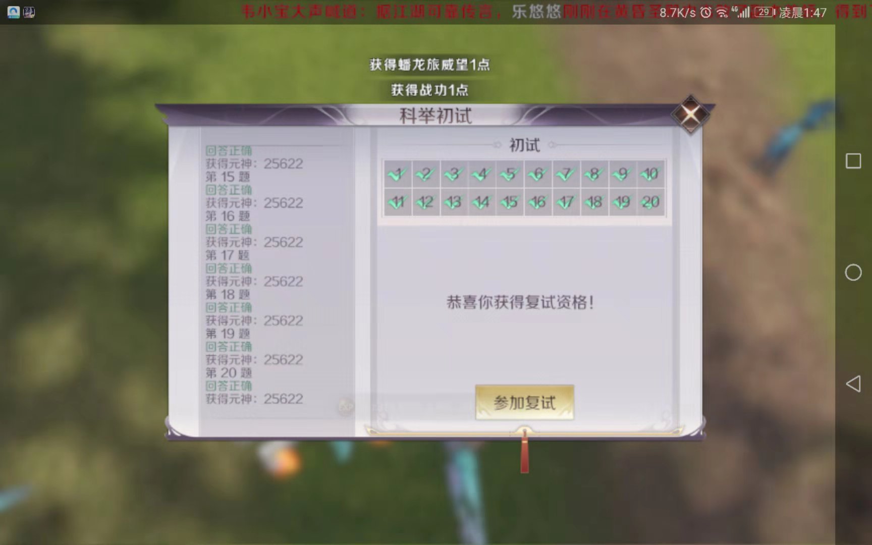 完美世界3D手游的一周一次的科举考试来临,为了方便大家更够顺利的通过科举考试,小编也是费尽心思,不过还好,小编收到一个绝密消息,那就是科举考试的试卷被破解,科举考试从此不用愁。 (答题都是100%全对)