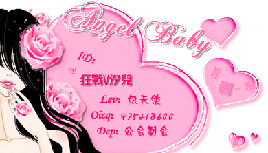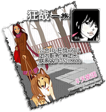 狂战一族网游公会在2006年11月11日成立以后,公会因女性同胞较多,成立了公会MM团 此图片是当年公会天使MM团的宣传图~ 此图片是当年公会天使MM团的名片,图片是MM团团长狂战V汐儿 公会天使MM团的名片2(责任编辑:狂战V味道) |